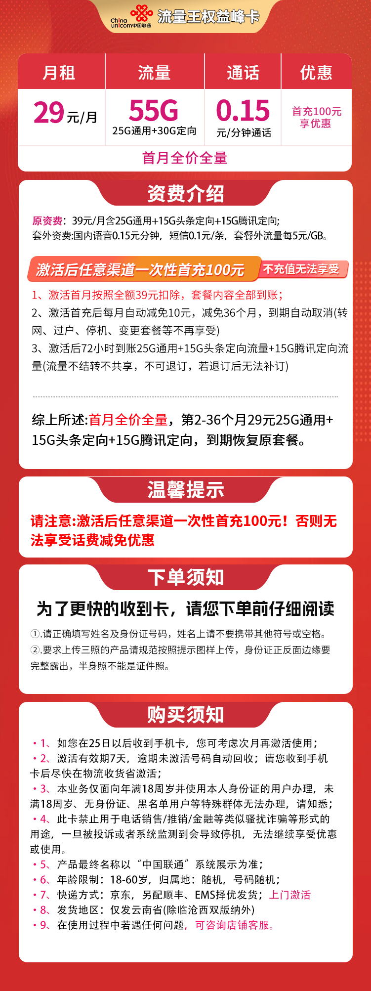 - 云南专属流量卡:首充100元后,前36个月每月29元,包含25G通用流量+15G头条定向+15G腾讯定向流量。首月按39元扣费,流量全量到账。