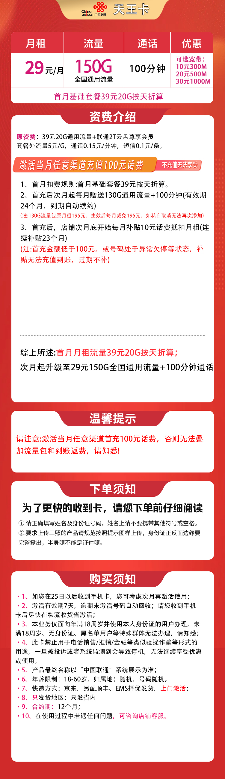 联通天王卡29元150G+100分钟【只发省内】