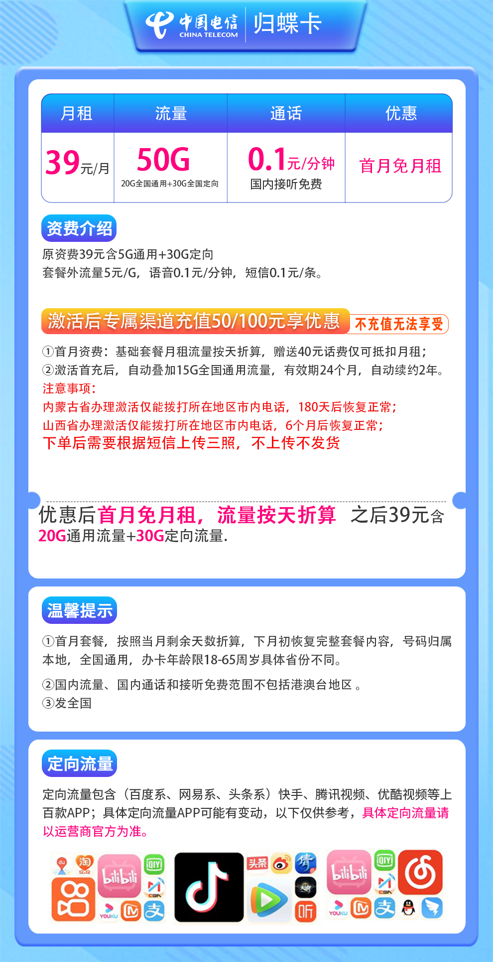- 电信归蝶卡月租39元,含50G流量(20G通用+30G定向),全国可用。首月免月租,流量按天折算。激活后需充值50或100元才能享受优惠,充值后额外送15G通用流量(有效期2年,自动续约)。注意:内蒙古、山西用户激活后前6个月只能拨打本地电话,下单后需按短信要求上传照片。