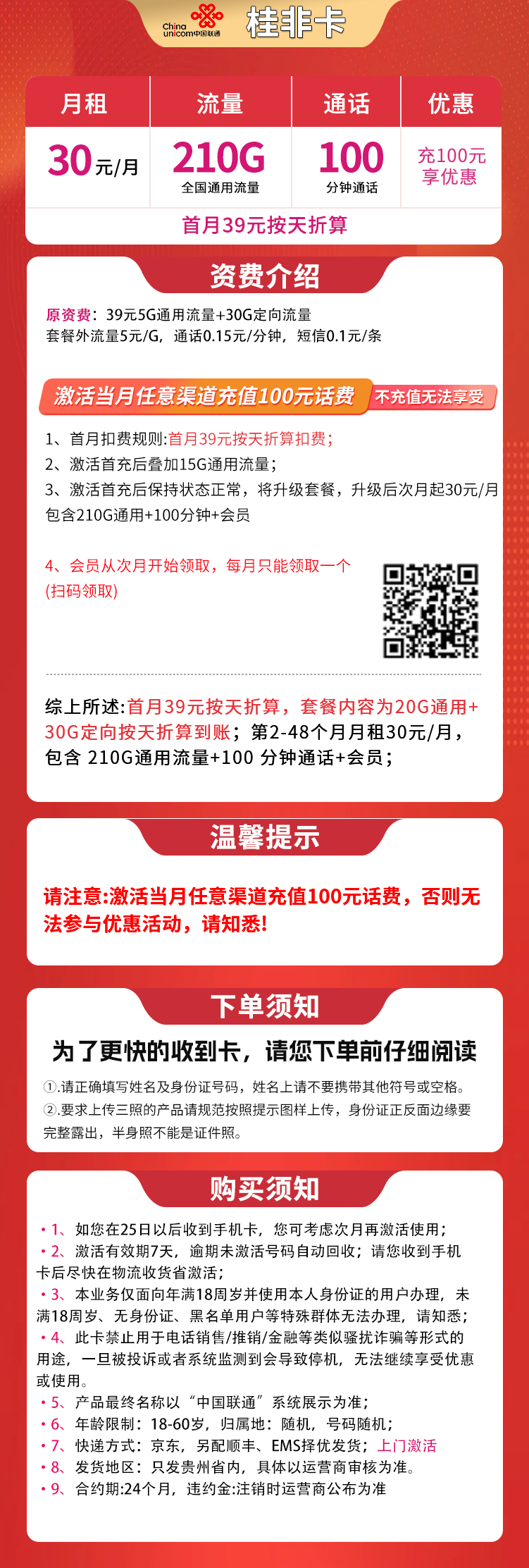 - 贵州联通专属套餐:30元月租,包含210GB流量和100分钟通话。