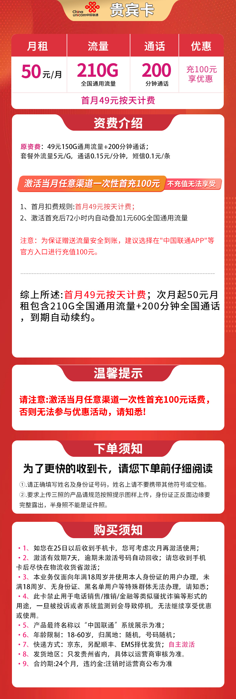 贵州联通用户专享:50元月租,包含210GB流量和200分钟通话。