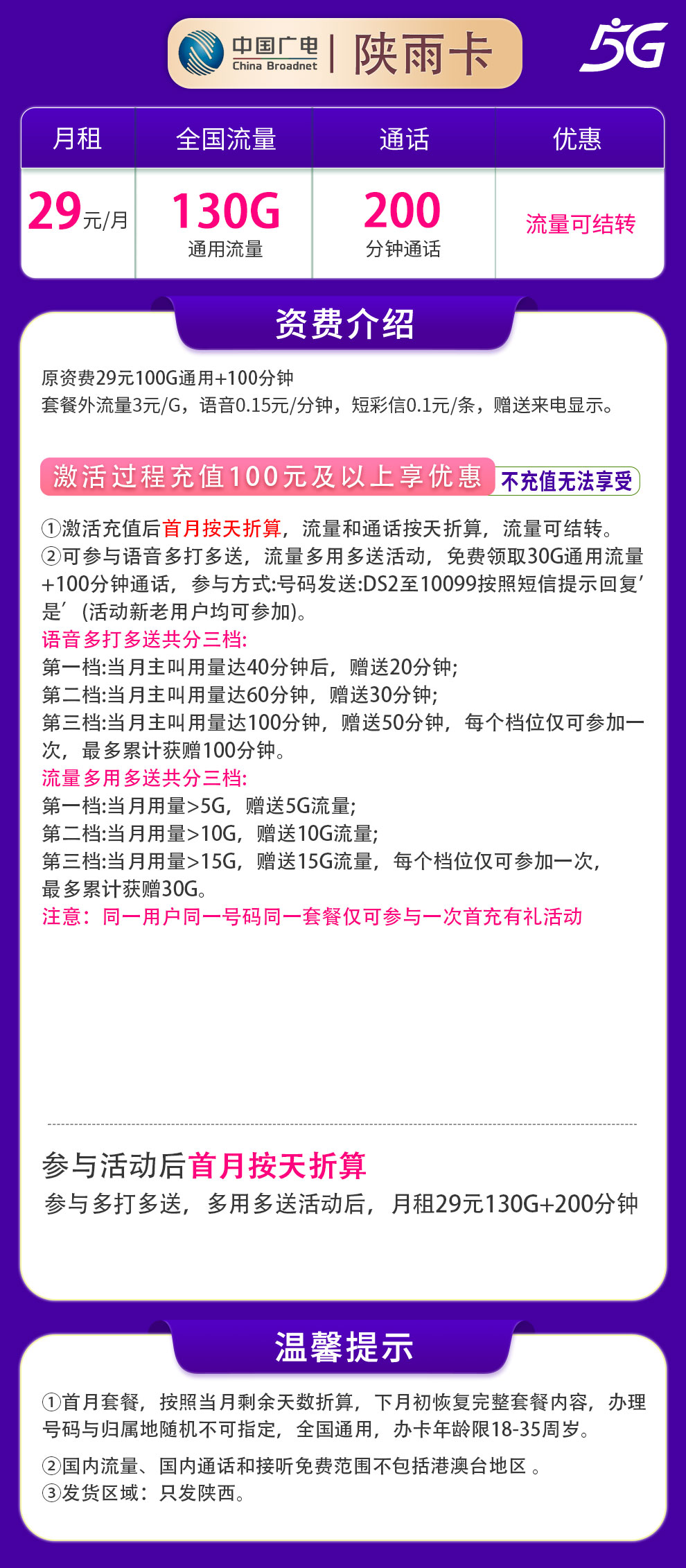 广电陕雨卡29元130G+200分钟【只发陕西】