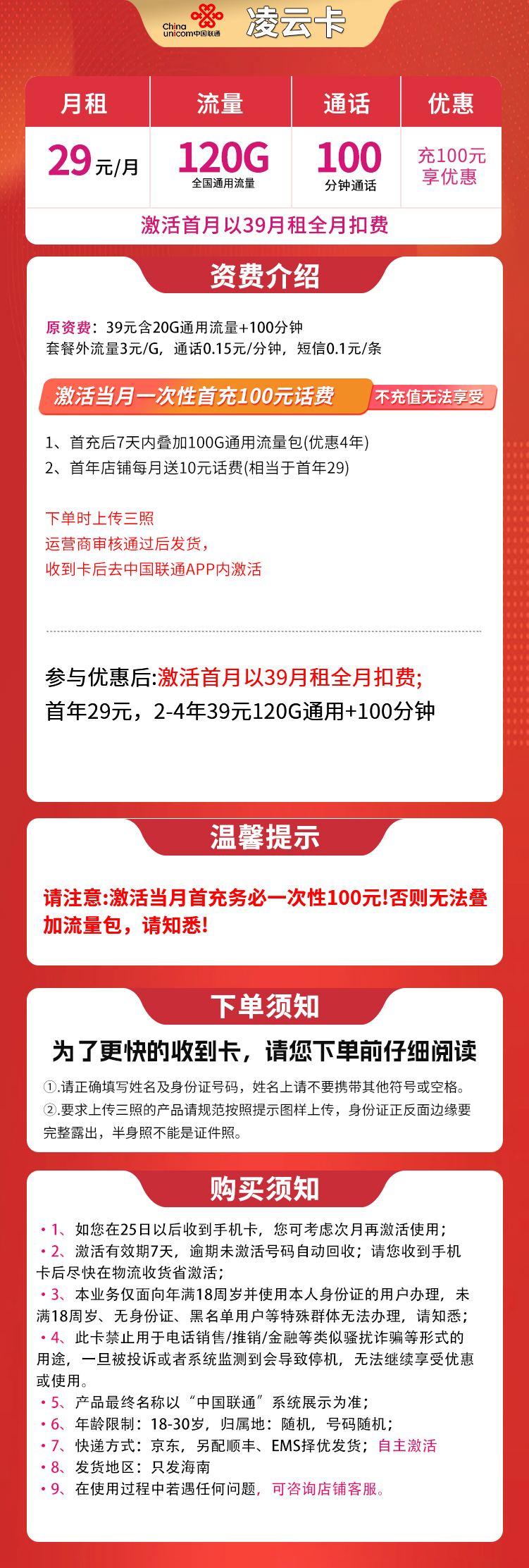 联通凌云卡29元120G+100分钟【只发海南】