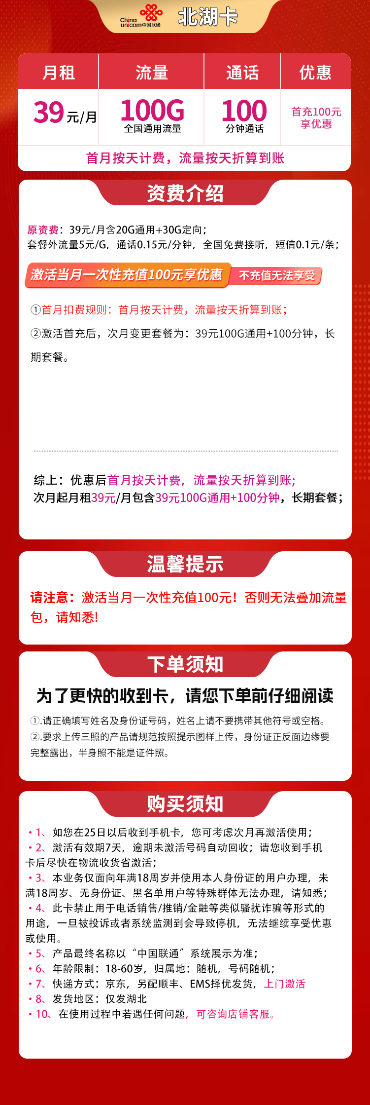 从次月开始,每月39元,包含100G通用流量和100分钟通话,长期有效。