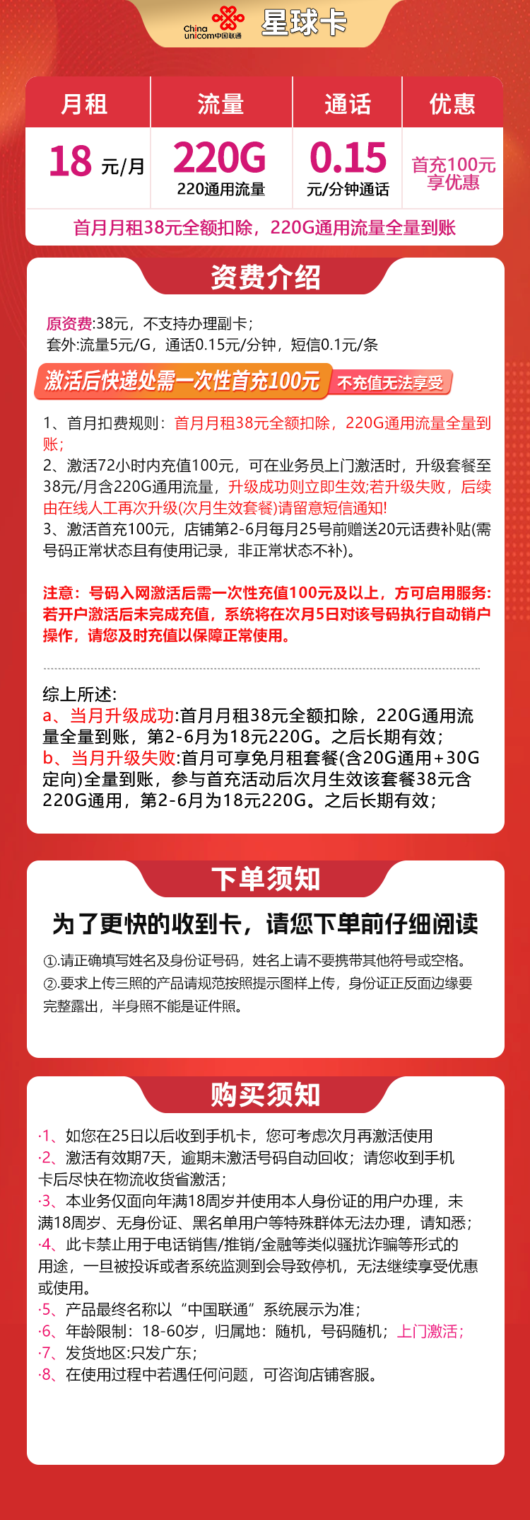 2、激活72小时内充值100元,可在业务员上门激活时,升级套餐至38元/月含220G通用流量,升级成功则立即生效;若升级失败,后续由在线人工再次升级(次月生效套餐)请留意短信通知!