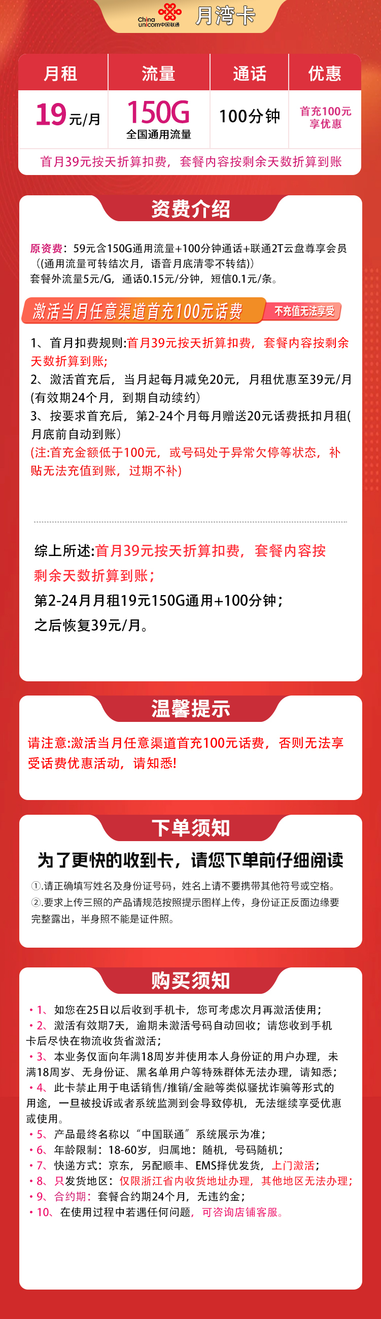 首月月租流量按天折算;第2-24个月19元150G+100分钟;