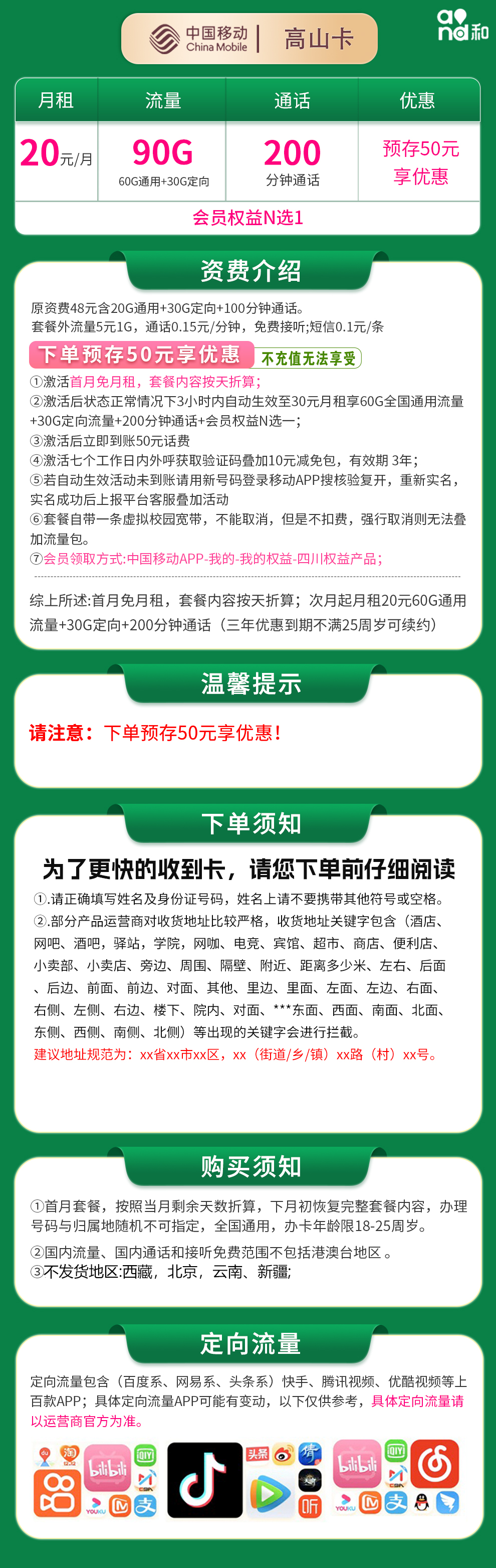 移动高山卡:月租20元,含90G全国通用流量和200分钟通话。