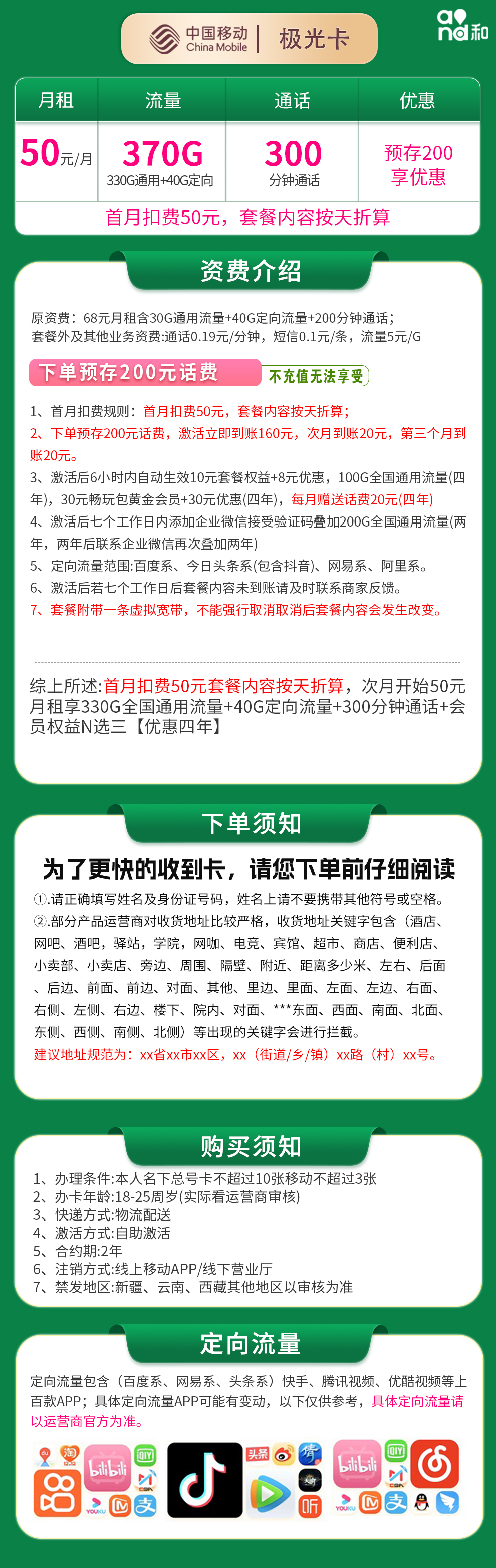 - 移动极光卡:50元月租,含330G全国通用流量+40G定向流量+300分钟通话+会员权益(四年优惠)。首月扣50元,套餐按天折算。需预存200元话费,激活后分月到账。注意:激活后需添加企业微信叠加流量,附带虚拟宽带不可取消。