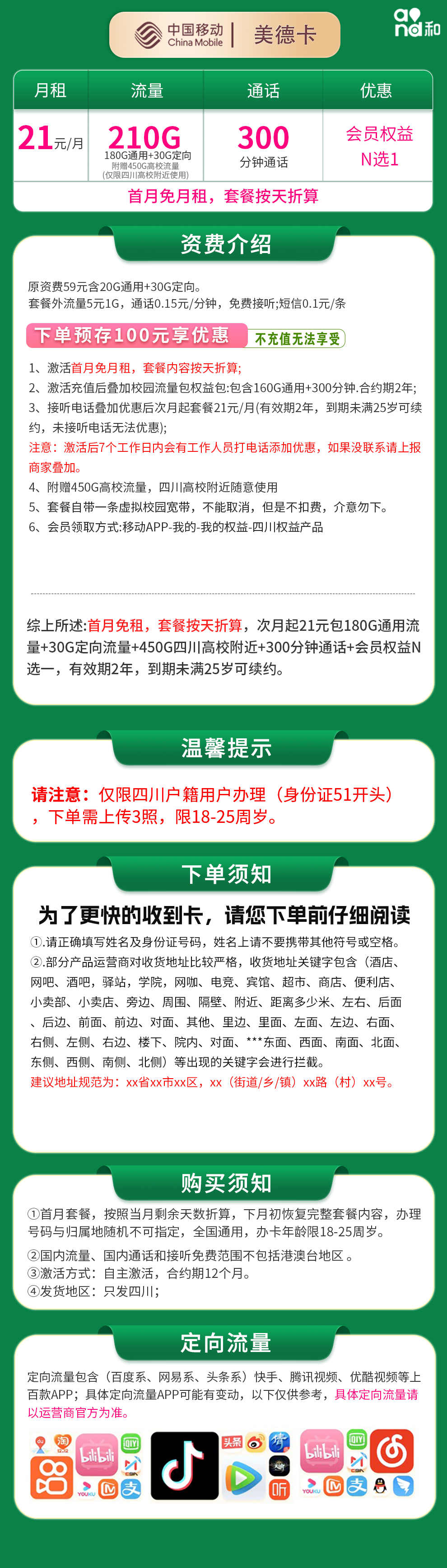 - 移动美德卡:21元月租,包含210G流量和300分钟通话,仅限四川地区办理。