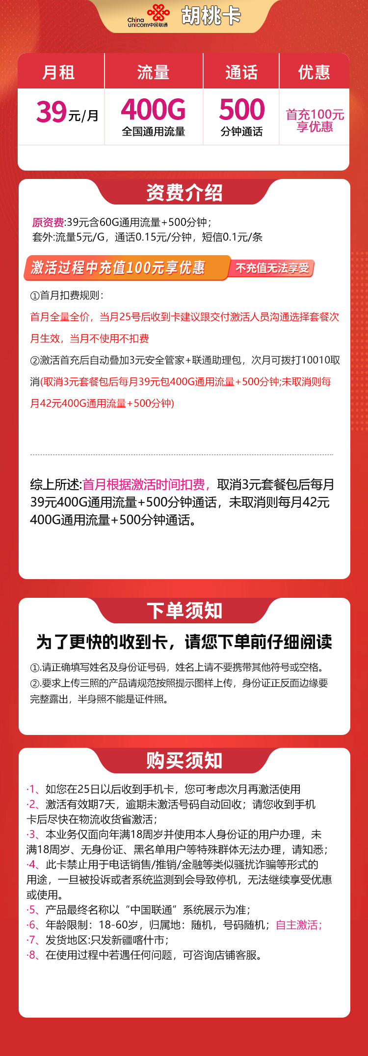 联通胡桃卡39元400G+500分钟【只发新疆喀什】