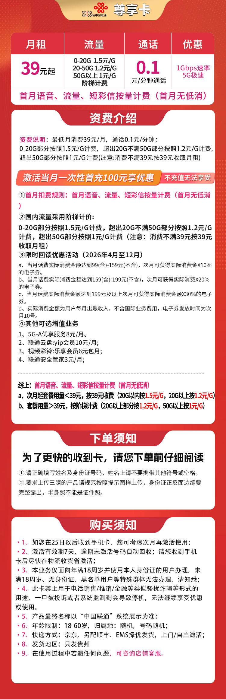 - 39元每月:100分钟通话 + 150G流量(含100G通用+50G定向),超出流量5元/G,归属地贵州,仅限贵州发货。