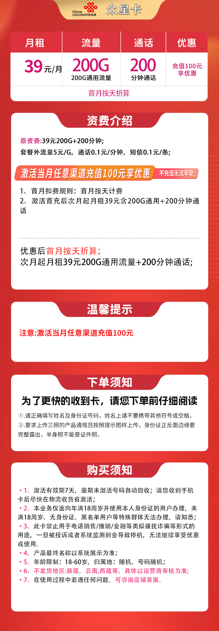 - 联通众星卡:月租39元,200G通用流量+200分钟通话。激活当月需充100元,首月按天计费,次月起享受优惠。