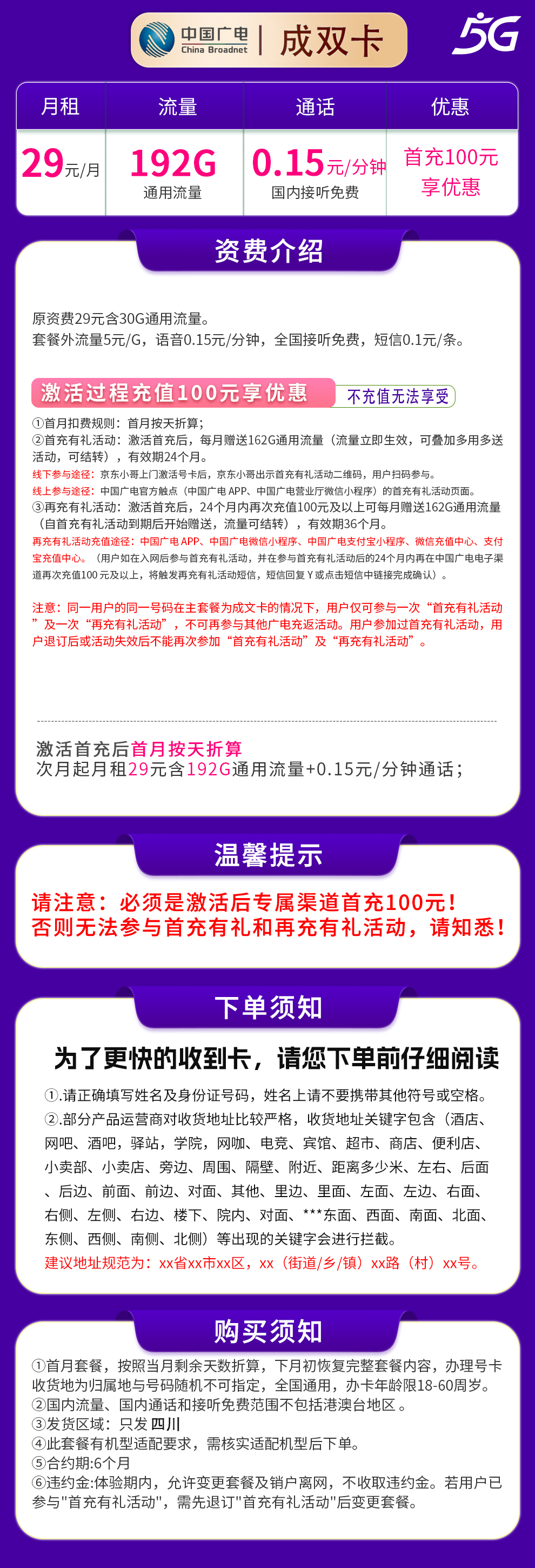 N广电成双卡29元192G【只发四川】
